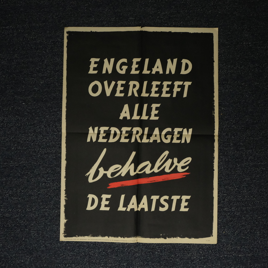 Affiche, 'Engeland overleeft alle nederlagen behalve de laatste'. Met onderschrift 'goedgekeurd door het departement van volksvoorlichting en kunsten no. 35. Uithangtijd van 10 september tot 15 ...