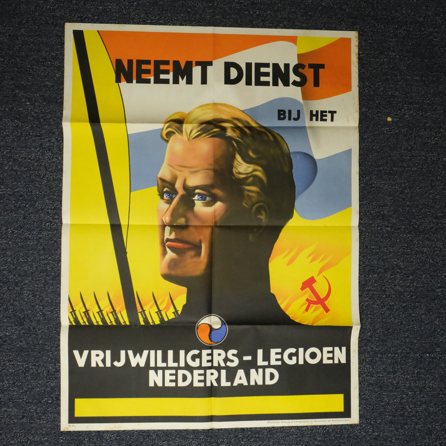 Affiche, 'Neemt Dienst bij het vrijwilliges-legioen Nederland'. Met onderschrift 'Öffentlich Aushang genehmigt durch die Dienststelle des Reichskommissaris'