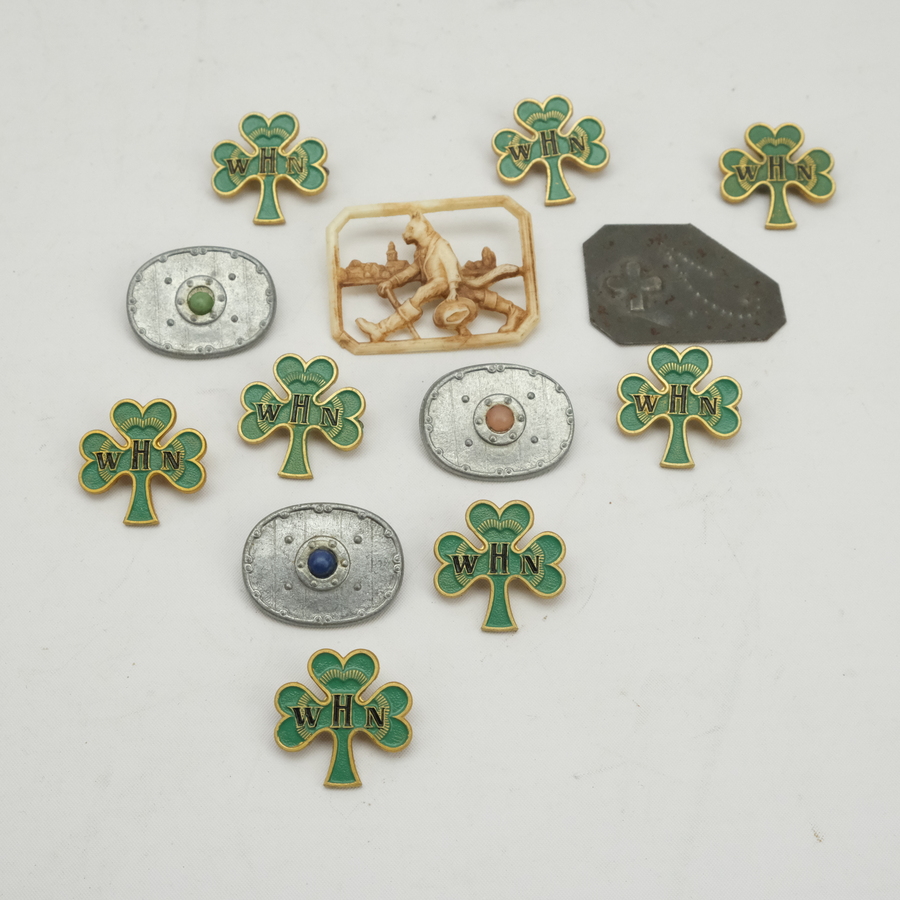 Lot diverse Winterhulp spelden: 8 groen emaille collectantenspelden met opschrift 'WHN', periode 1940-1942, drie Duitse Winterhilfswerk spelden in de vorm van oude Germaanse schilden uit de Stee...