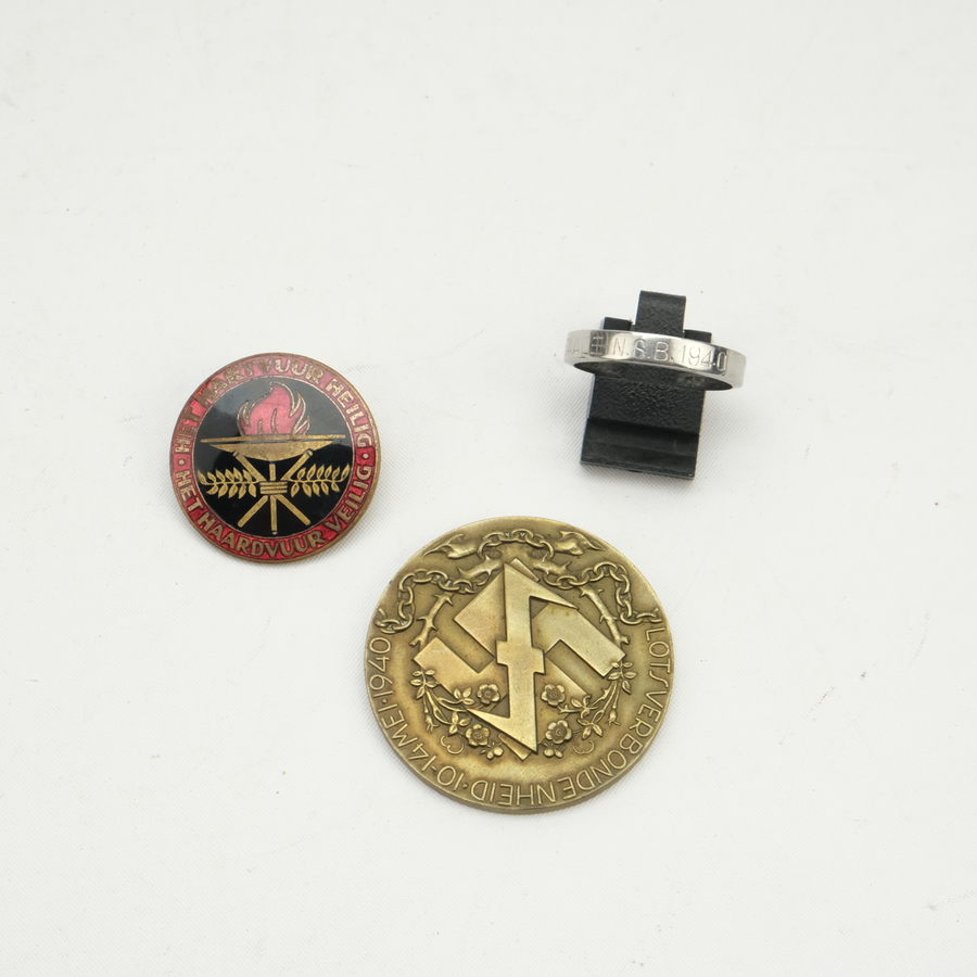 Lot van drie stuks: een bronzen penning 'Lotsverbondenheid 10-14 mei 1940', en tekst 'Dietschers en Duitschers verbonden in de toekomst', 'samengedreven door het lot - vereend in gevaar'. Uitgeg...