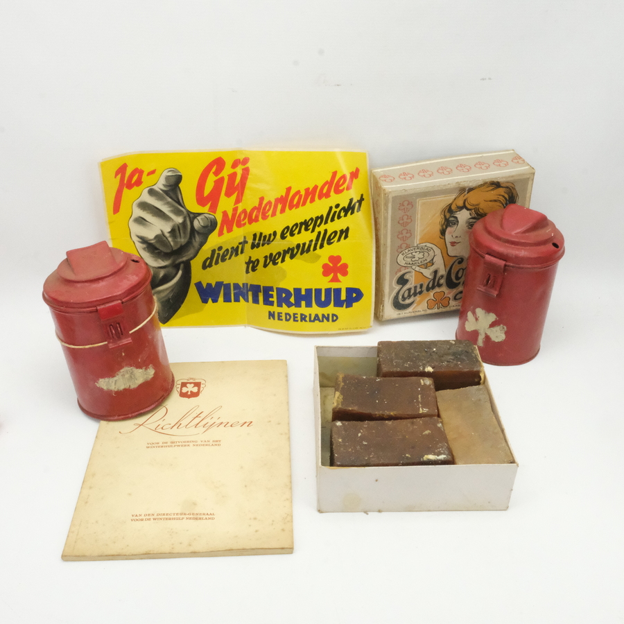 Lot Winterhulp, waaronder twee rode collectebussen en het boek 'Richtlijnen voor de uitvoering van het Winterhulpwerk Nederland'