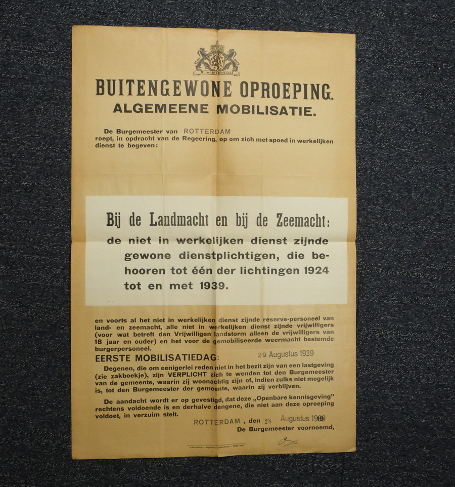 Affiche, 'Buitengewone oproeping Algemeene Mobilisatie'. Gedateerd Rotterdam, 28 augustus 1939