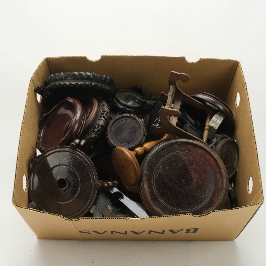Een lot met diverse houten en kunstof bordenhouders en een aantal houten onderzetters voor vazen, waaronder met gestoken decoraties.