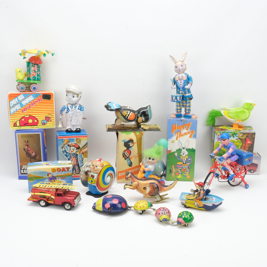 Lot divers Chinees blikken speelgoed, 20e eeuws, waaronder een blikken specht