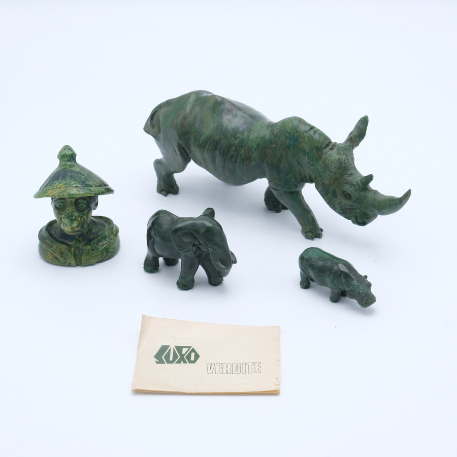 Lot van vier verdiet sculpturen: neushoorn, olifant, nijlpaard en afrikaanse man met hoed. Laatstgenoemde gemerkt 'verdite - A suro product - South Africa', olifant gemerkt 'Suxo verdite'