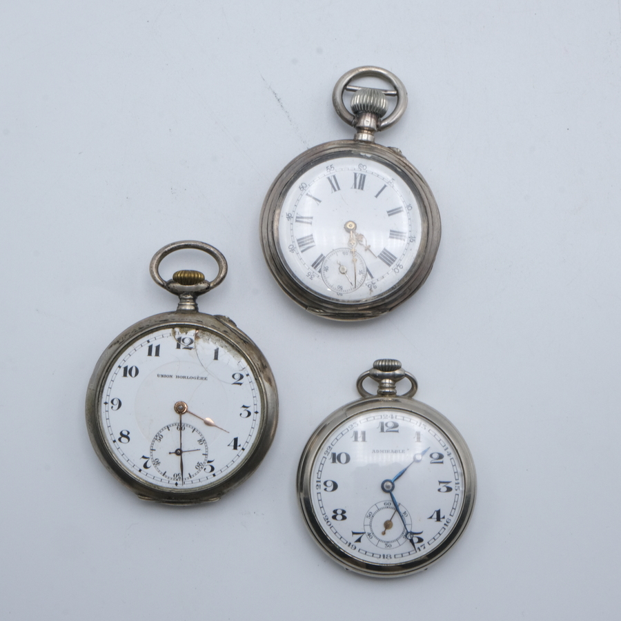Lot van twee derde gehalte (800/1000) zilveren zakhorloges, één gemerkt Union Horlogerie. Met daarbij een verzilverd exemplaar, gemerkt 'Admirable'