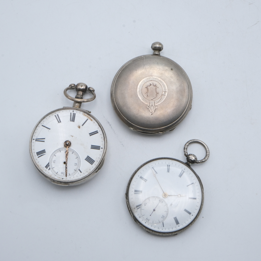 Lot van drie zilveren zakhorloges, waaronder een snek (beschadigd) en een exemplaar in derde gehalte (800/1000) zilveren kast
