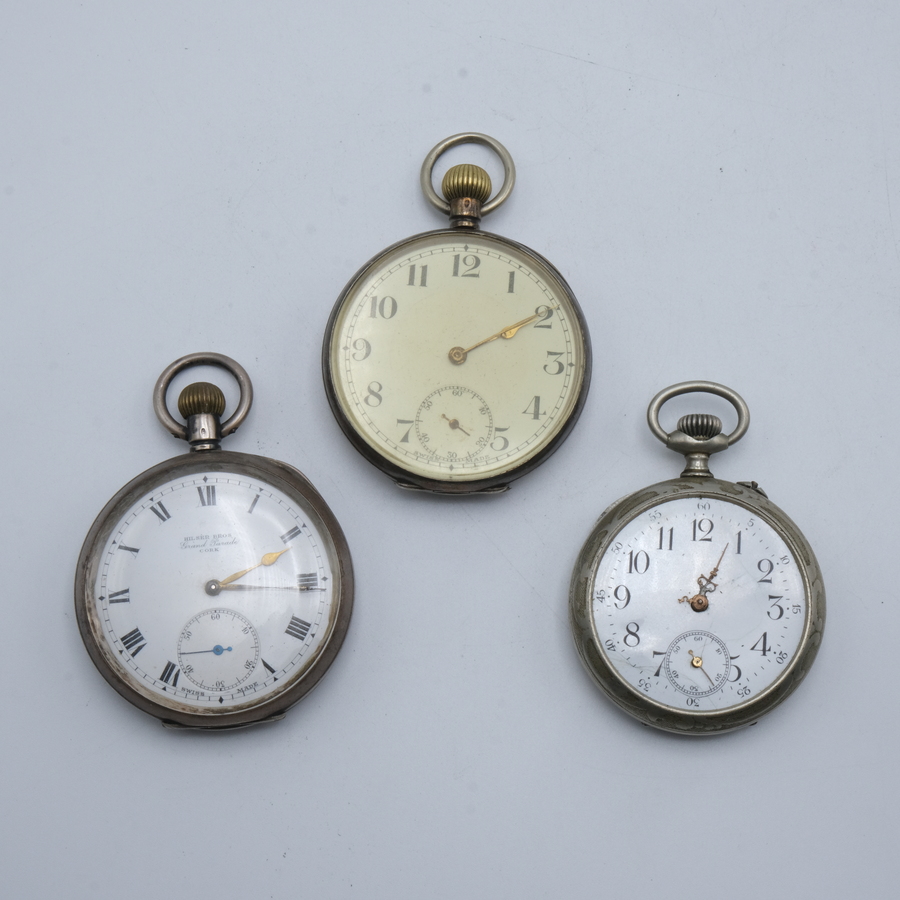 Lot van drie zakhorloges, waaronder twee eerste gehalte (925/1000) Engels zilveren exemplaren, gemerkt 'Hilser Bros Grand Parade Cork' op de wijzerplaat.
