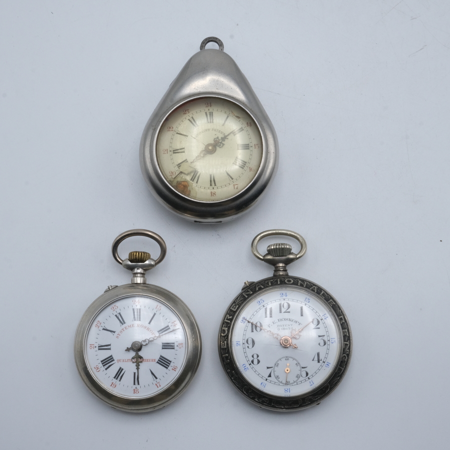 Lot van drie Roskopf zakhorloges, waaronder een derde gehalte (800/1000) met decor van paarden op de achterzijde en één met alle provincies van Belgie, het 'L'Heure Nationale Belge' model,