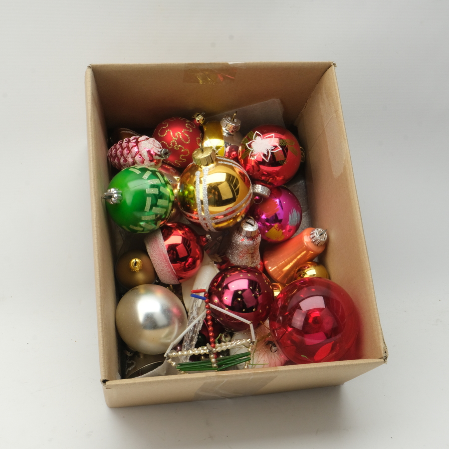 Een lot met diverse glazen en kunststof Kerstboom versieringen. Bestaande uit ballen, eekhoorn, scheepje en dennenappel.