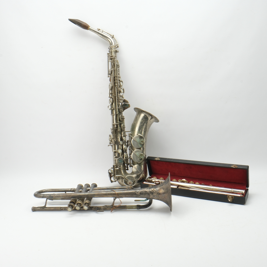 Drie muziekinstrumenten: een saxofoon, dwarsfluit en trompet. Saxofoon gemerkt Toneking, dwarsfluit Noblet Paris, trompet Canterini 1880
