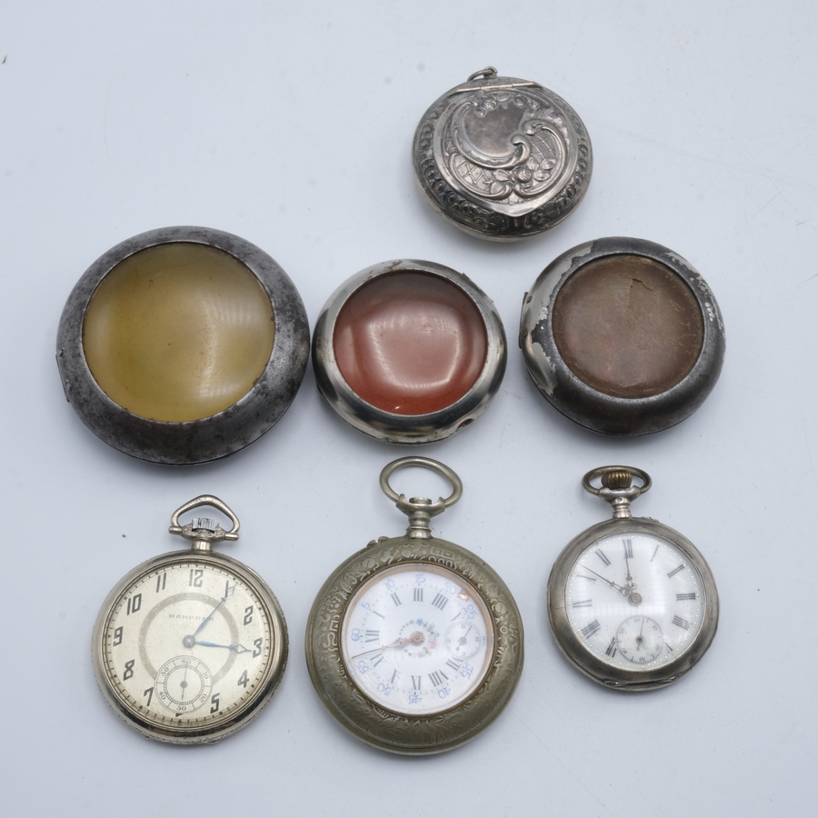 Lot van drie zakhorloges, waaronder een verguld exemplaar, gemerkt Admiral, beschadigd. En een koperen exemplaar, gemerkt Haller, met decor van een trein op de achterkant.m