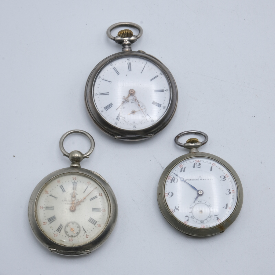 Lot van drie herenzakhorloges: een antiek 19e eeuws derde gehalte (800/1000) zilveren zakhorloge, en zakhorloges met opschrift ' Luzerne Watch Co' & 'Jerome Feyen Stabroeck'
