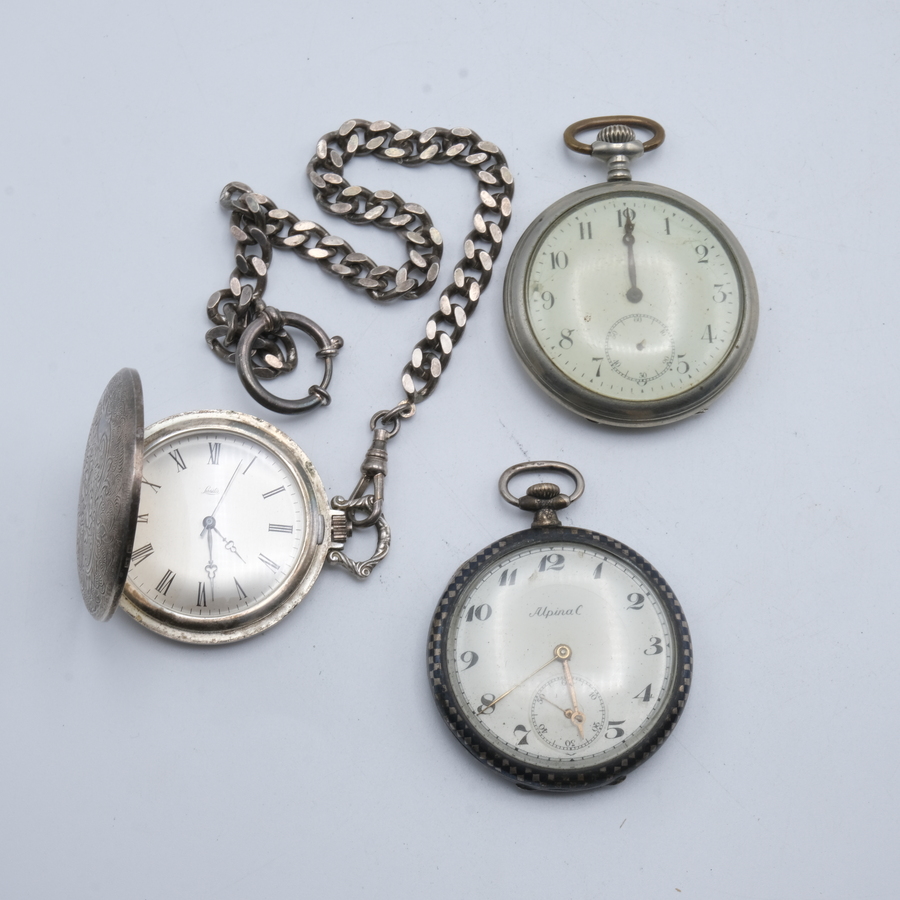Lot van drie herenzakhorloges, waaronder een derde gehalte (800/1000) zilveren niello zakhorloge, Alpina, en een tweede gehalte (835/1000) zilveren zakhorloge aan eerste gehalte (925/1000) zilve...