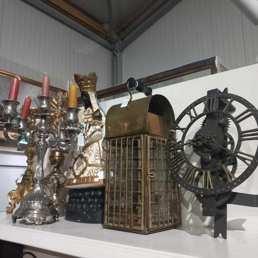 Lot divers, waaronder een Warmink skeletklok, twee heiligenbeelden en een koperen koetslamp