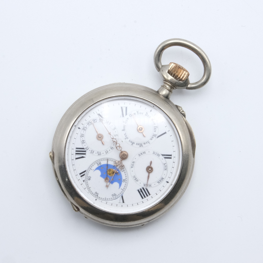 Een 20e eeuws Frans zakhorloge met maand-, dag- en datumaanduiding, en tevens maanstand op de wijzerplaat. In verzilverde kast