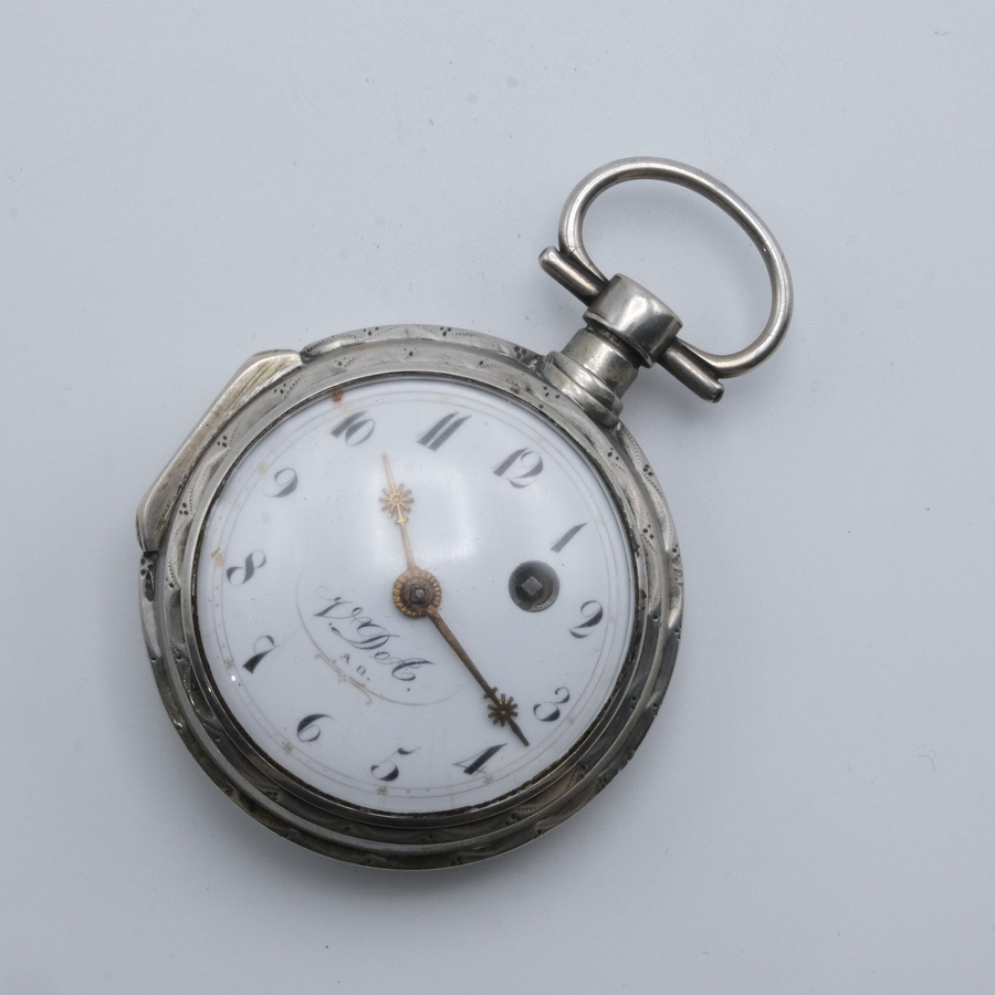 Een antiek 18e/19e eeuws zilveren zakhorloge, snek, gemerkt op de wijzerplaat 'V.Det'