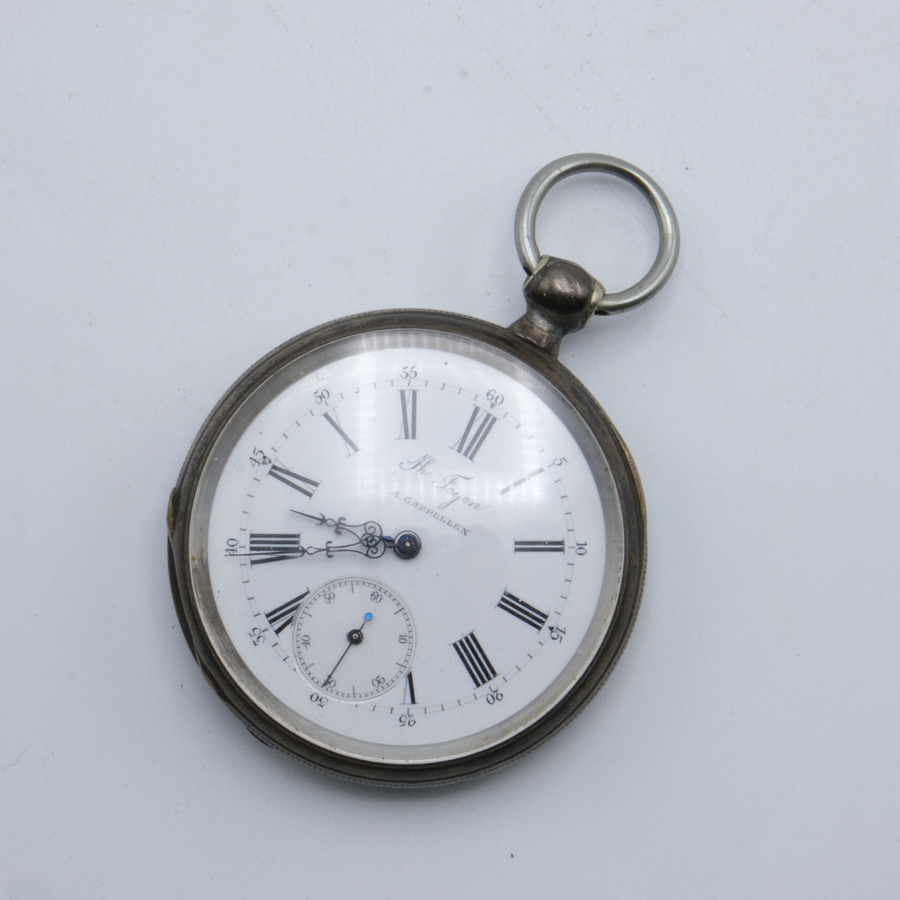 Een zilveren herenzakhorloge met emaille wijzerplaat, met opschrift 'Jh. Feyen a Cappellen'