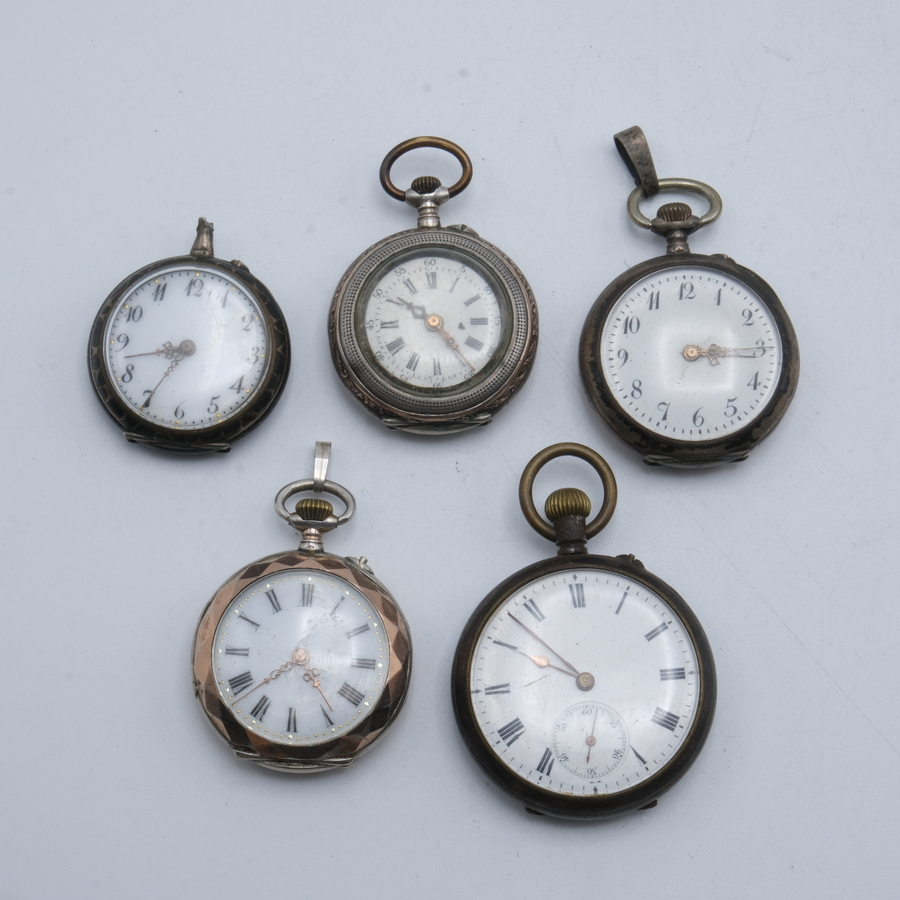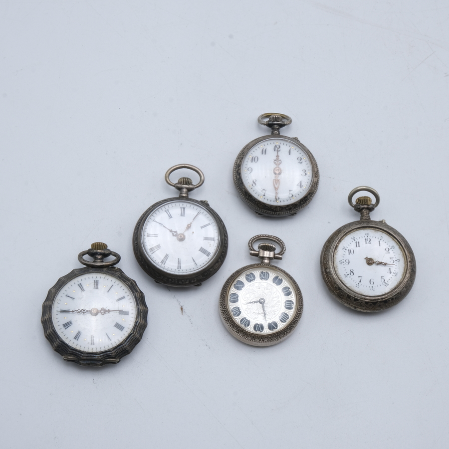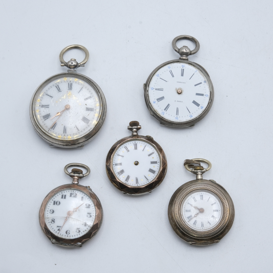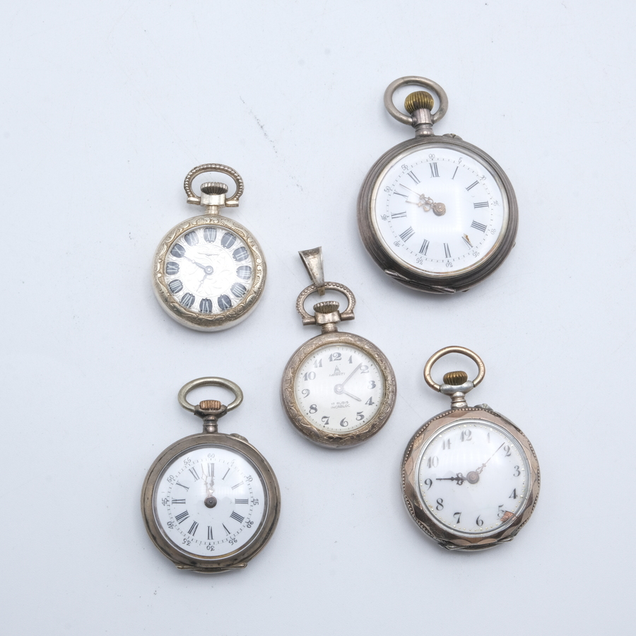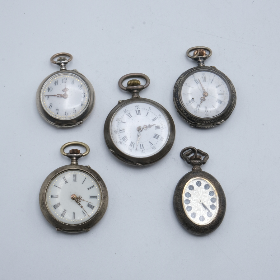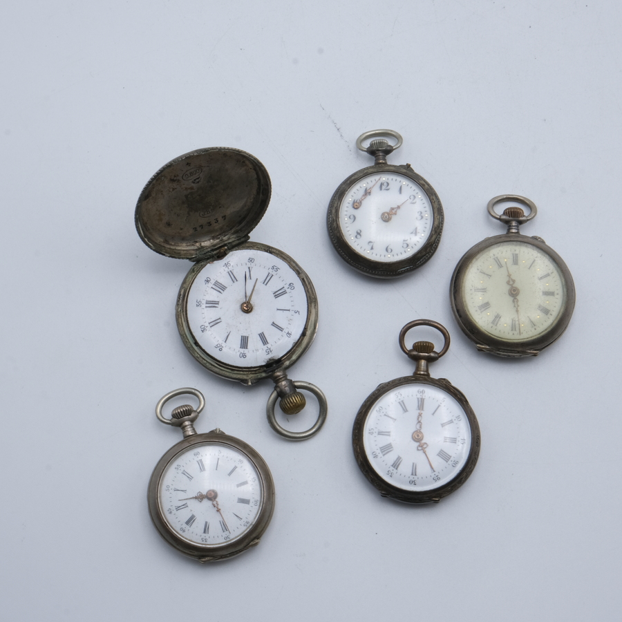 Lot van vijf antieke dameszakhorloges, allen in derde gehalte (800/1000) zilveren kast