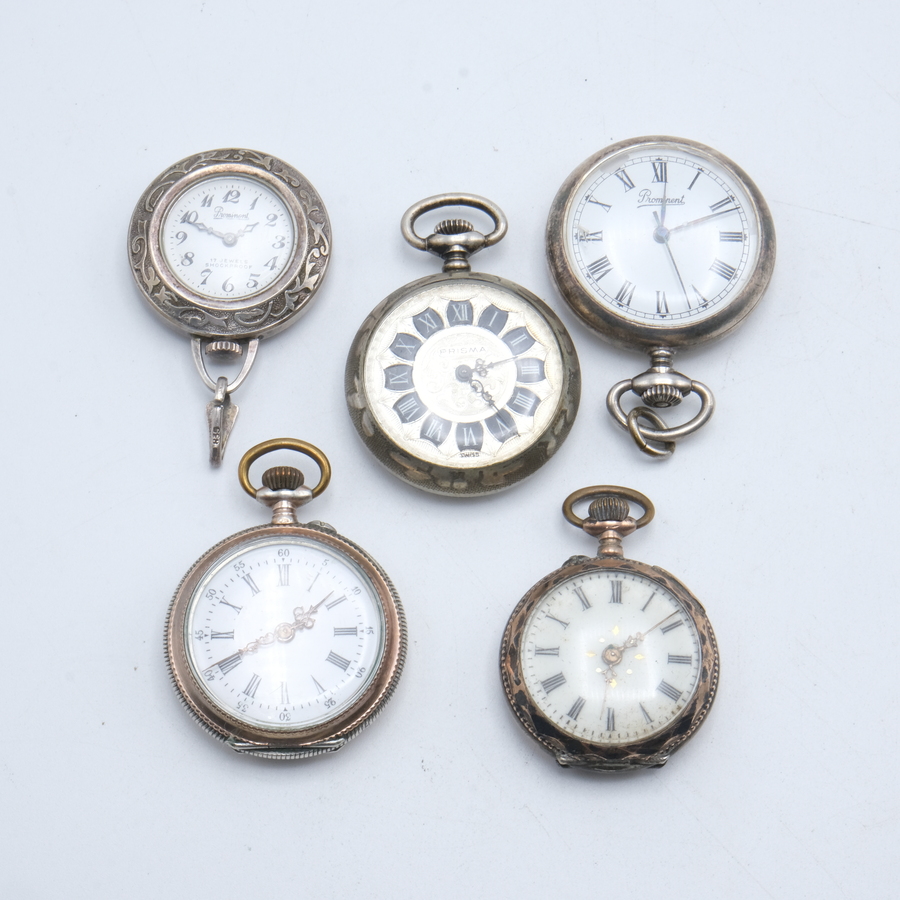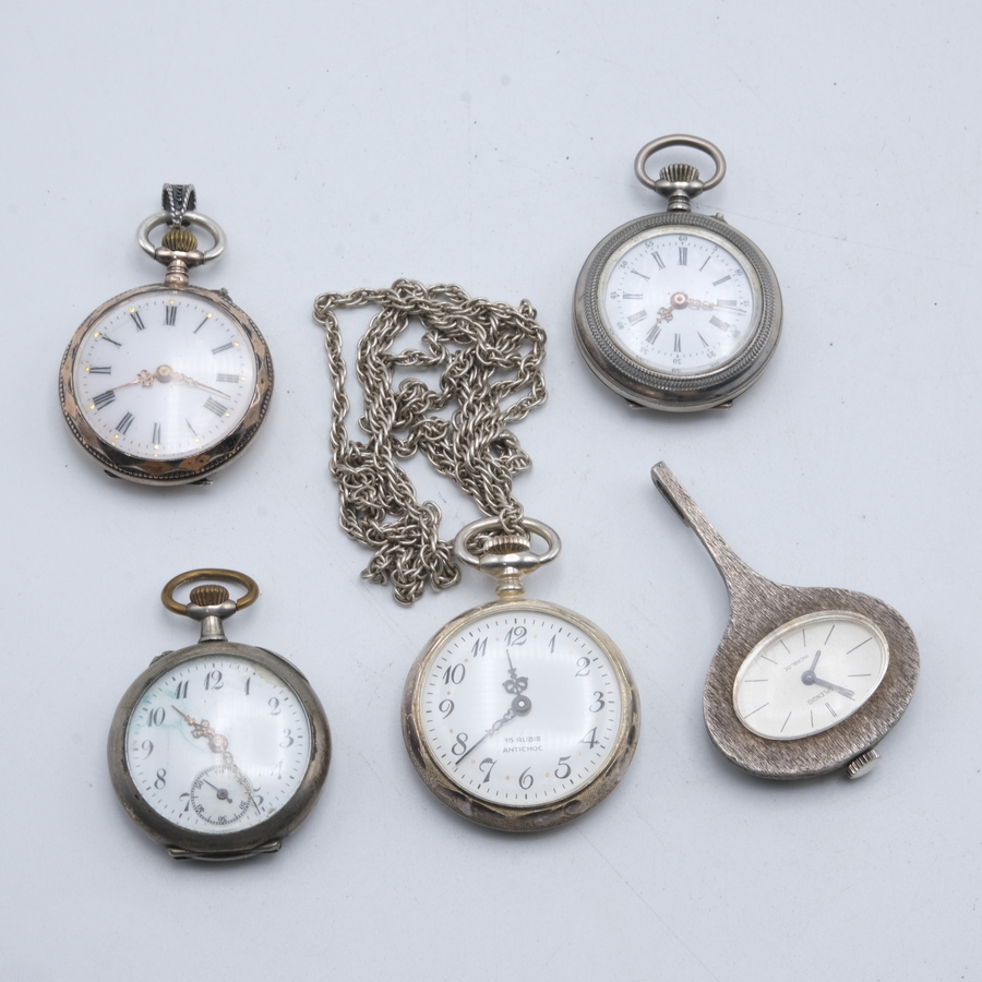 Lot van vijf zilveren dameszakhorloges, waaronder een tweede gehalte (835/1000) zilveren zakhorlogeketting