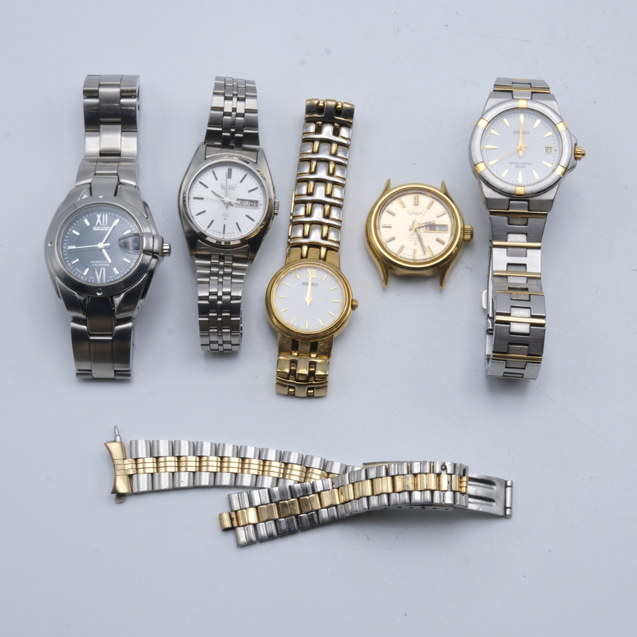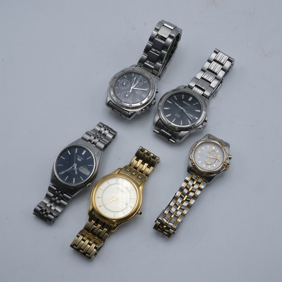 Lot van vijf Seiko horloges: Seiko 5 met gebroken glas, 7009-3060, Seiko Solar 100M, V158-0AD0, Seiko Kinetic 72 hrs, 3M22-0A33, Seiko chronograaf, V657-9010, en een vergulde Seiko, type 7N32-0D...