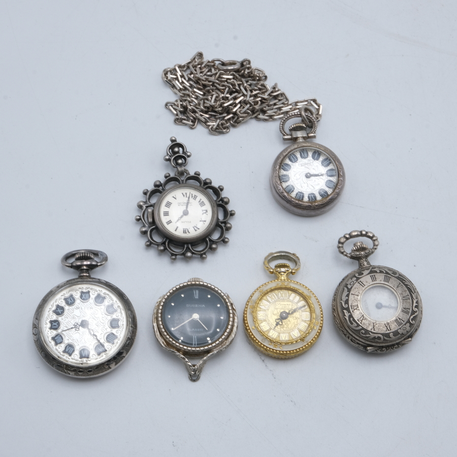 Lot diverse dameshorloges, waaronder een eerste gehalte (925/1000) zilveren hanger, Ancora, twee derde gehalte (800/1000) zilveren zakhorloges en twee zilveren horlogekettingen