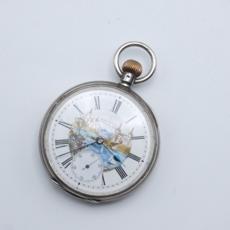 Een 20e eeuws eerste gehalte (935/1000) zilveren zakhorloge met landschapsdecor op emaille wijzerplaat, gemerkt AWW Co Waltham