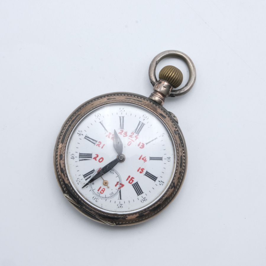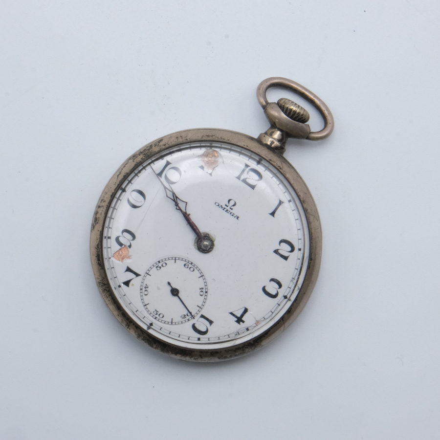 Een 20e eeuws derde gehalte (800/1000) zilveren zakhorloge, Omega, wijzerplaat met beschadigingen