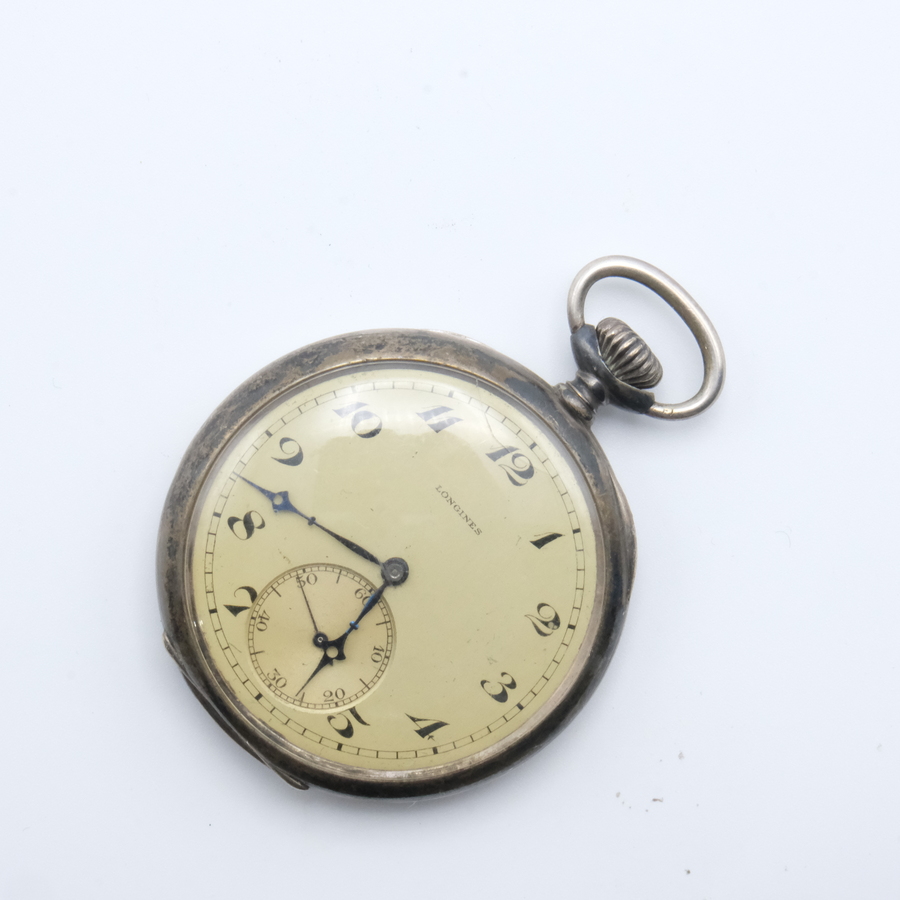 Een 20e eeuws derde gehalte (800/1000) zilveren zakhorloge, gemerkt Longines op de wijzerplaat