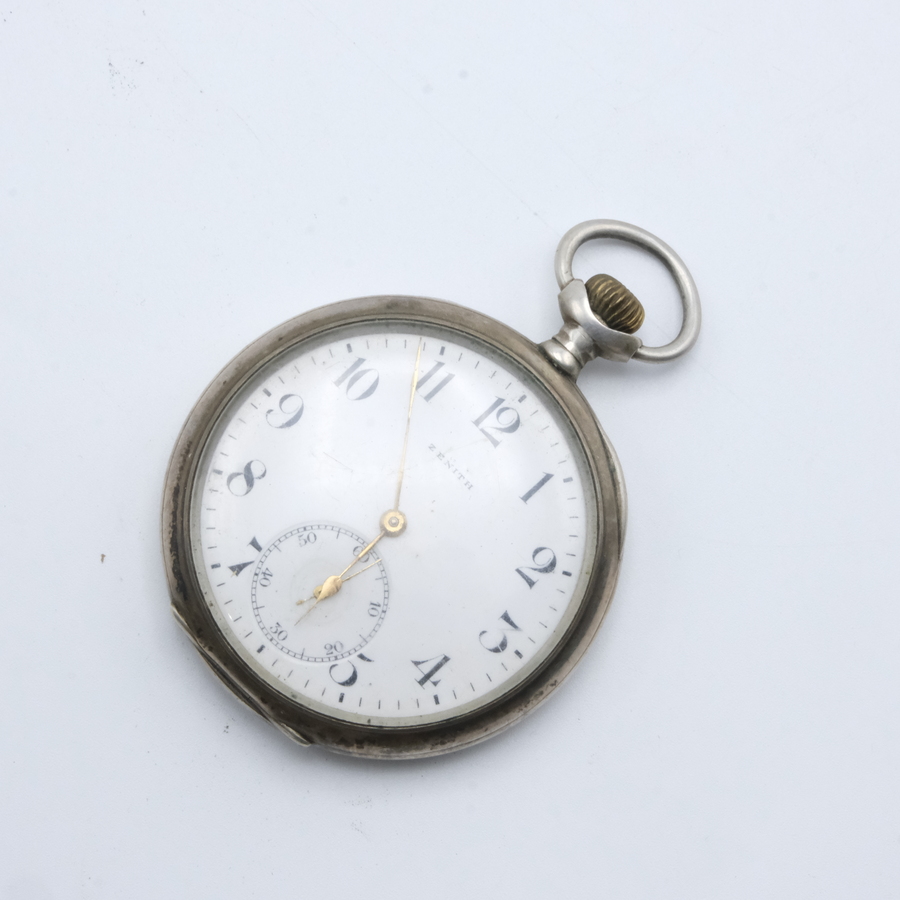Een 20e eeuws derde gehalte (800/1000) zilveren zakhorloge, gemerkt Zenith op de wijzerplaat.