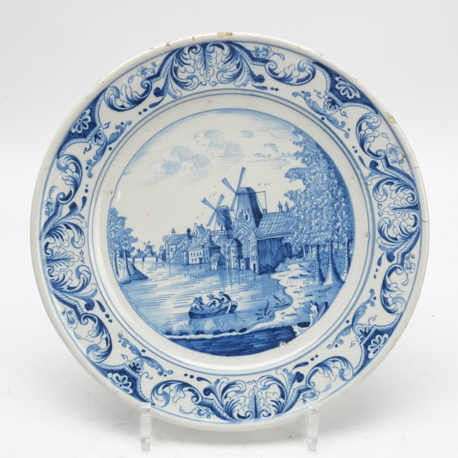 Een 18e eeuws Fries aardewerken blauw-wit gedecoreerd bord, met decor van een bootje met vier figuren voor een dorp of stad met twee molens.