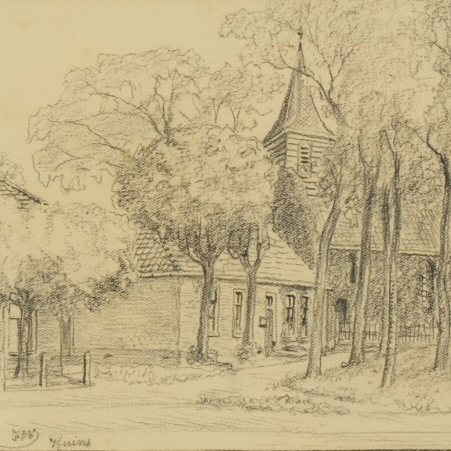 Tekening op papier. Voorstelling van de kerk van Huins. Linksonder gemonogrammeerd ‘IW’ = Ids Wiersma (Brantgum 1878 – Dokkum 1965).