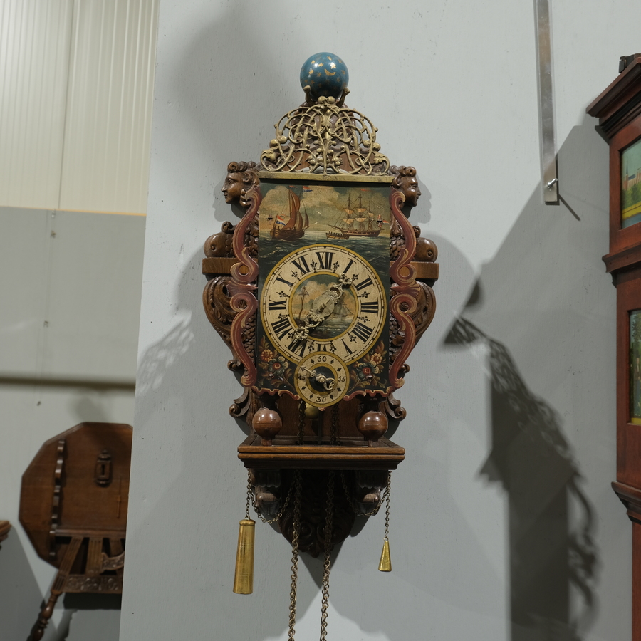 Een Hollandse stoelklok, vermoedelijk Zaans of West-Fries. Eikenhouten wandplank zonder kap, met gestoken decor van zeemeerminnen en schelpen. Uurwerk bekroond met atlas en gegoten ornamentiek, ...