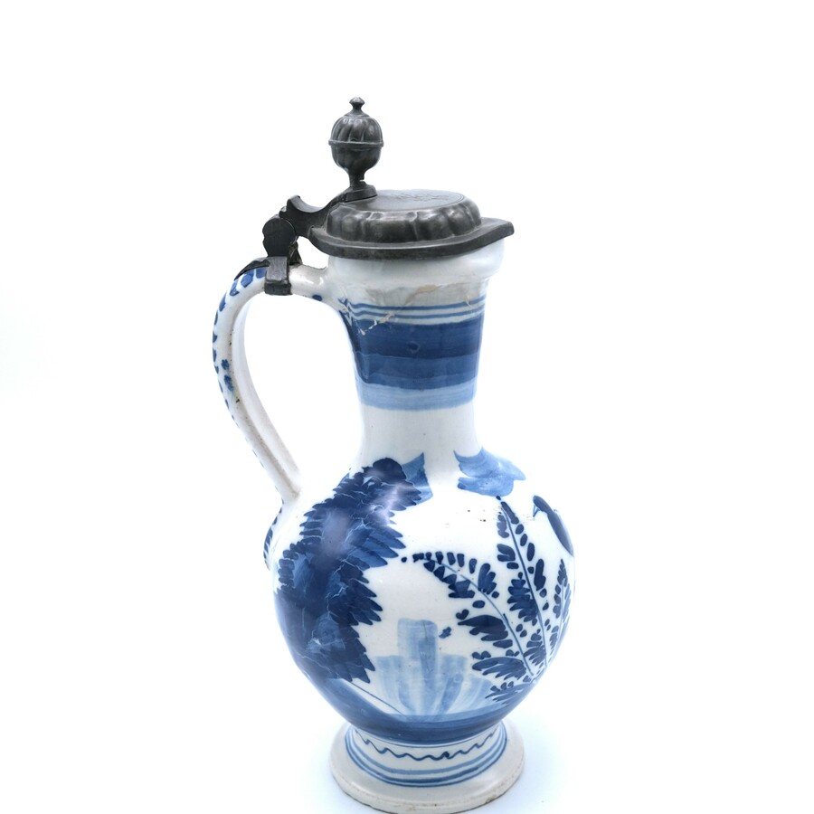 Een vroeg 18e eeuwse Delfts of Duitse aardewerken oorkan. Blauw/wit met een decor van een vogel tussen de takken. Voorzien van een tinnen deskel uit de periode met gravering K16. Ca. 1720.