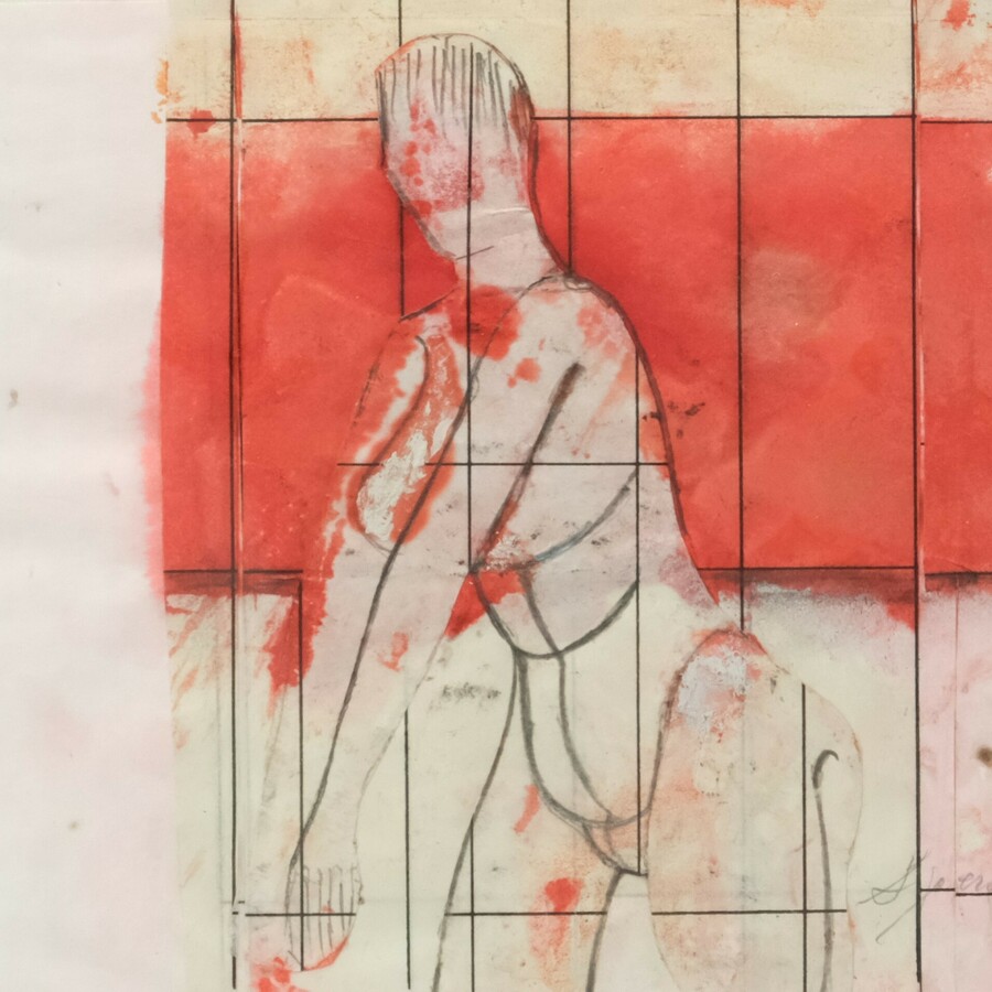 Twee schilderijen, gemengde techniek op papier. Vrouwelijk naakt met rode rechthoeken. Nr 1. en Nr. 5. Gesigneerd Sjoerd de Vries (Oudehaske 1941-Leeuwarden 2020) 1990. gelijst