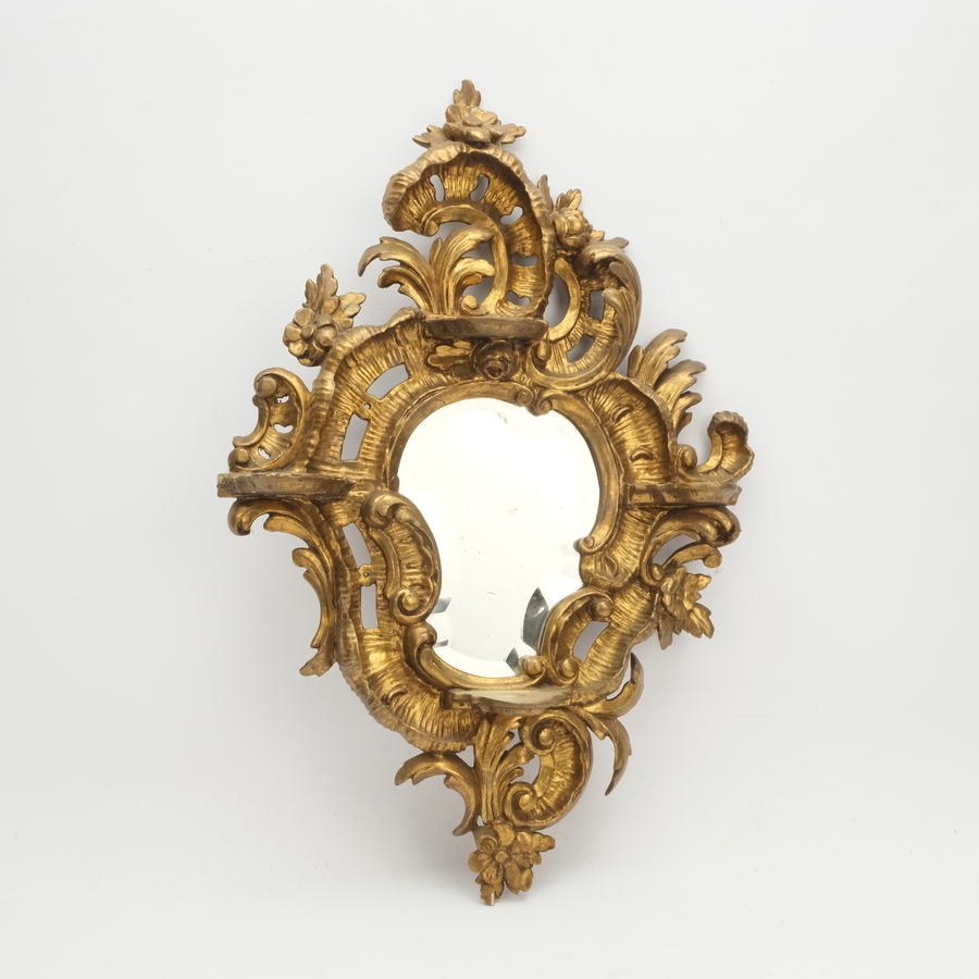 Een antieke facet geslepen spiegel in een roccoco uit hout gestoken en vergulde lijst met diverse plateaus voor miniatuur vazen. 18e eeuws.