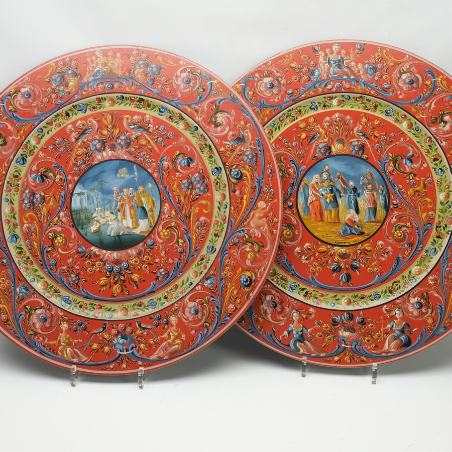 Vijf houten en Hindelooper beschilderde schotels. Met rondom beschilderde verschillende Bijbels en florale voorstellingen. Vervaardigd en beschilderd door Meine Visser (1946-2023)