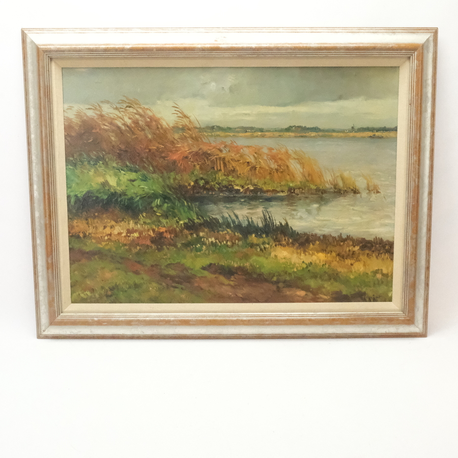 Schilderij, olieverf op board. Voorstelling van waaiend riet aan de waterkant. Rechtsonder gesigneerd Andries van der Sloot (Schalsum 1883 - Leeuwarden 1955)