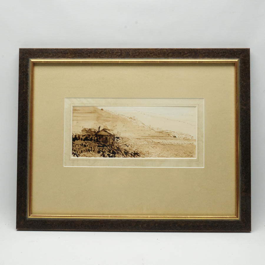 Een sepia aquarel, gemengde techniek op papier. Stad in de bergen met berghut in de voorgrond. Gesigneerd J.v. d. K. Is Jan van der Kooi (Groningen 1957). Gelijst.