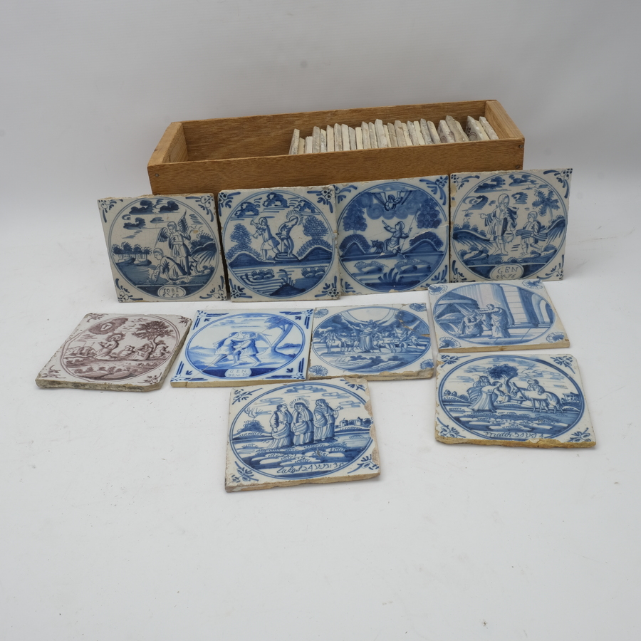 Krat gevuld met ca. 40 18e eeuwse mangaan en blauw-wit bijbeltegels