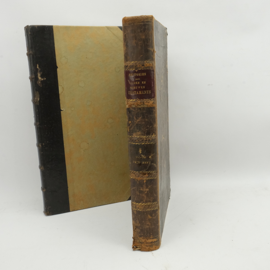 Een tweedelige vroeg 18e eeuwse boekenserie: "Historie des ouden en nieuwen testament, verykt met meer dan 400 print afbeeldingen van Pieter Mortier en David Martin. De zgn "Grote prentbijbel va...