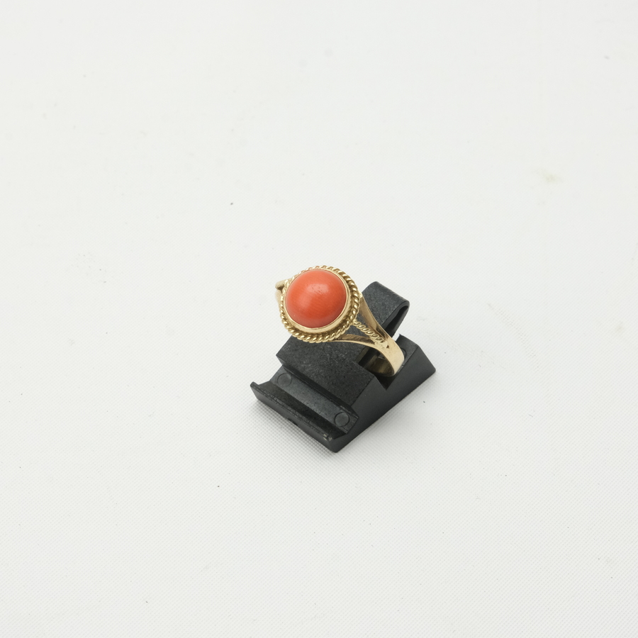 Een 14 karaats (585/1000) geelgouden damesring met ronde bloedkoraal