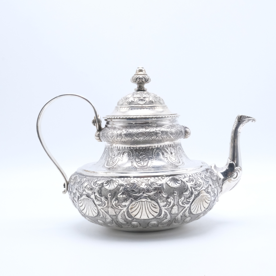 Een antieke derde gehalte (800/1000) zilveren trekpot, versierd met o.a. schelpmotieven en acanthusbladeren. Gemerkt met meesterteken 'JLV'