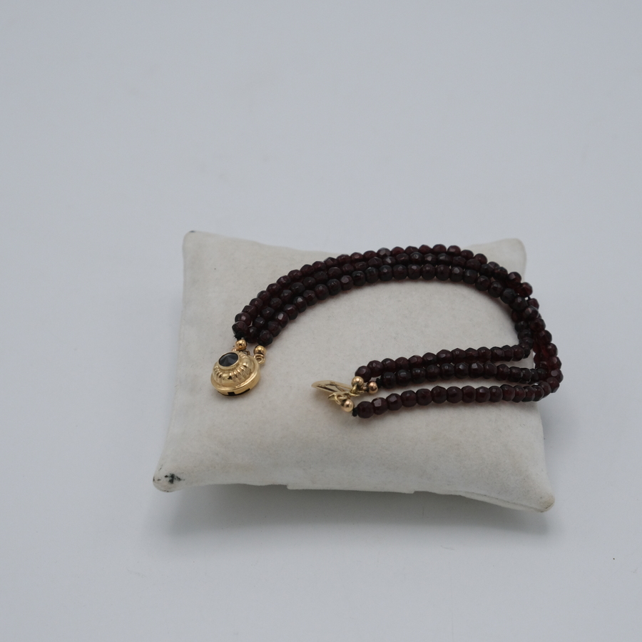 Een 20e eeuwse drierijig granaten armband met 14 karaats gouden slot bezet met granaat. Gemerkt op de sluiting met eikenblaadje en 'XXX' voor Amsterdam.