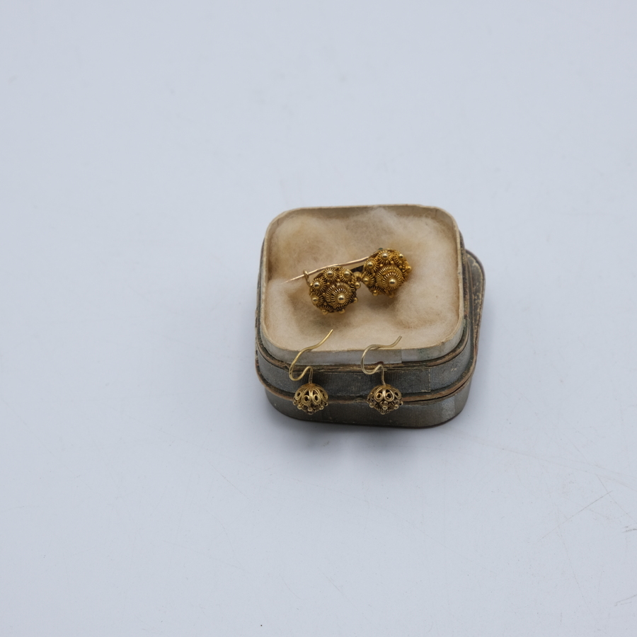 Twee antieke 14 krt gouden oorstekers en een broche met twee Zeeuwse knoppen. 19e eeuws in een antiek sierraden doosje.
