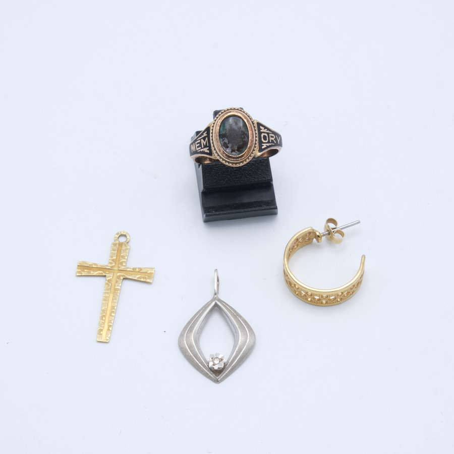 Lot diverse gouden sieraden: een 14 karaats (585/1000) witgouden hanger met kleine briljant geslepen diamant, een 14 karaats (585/1000) geelgouden hanger, Kruisje, een losse 14k oorbel en een an...