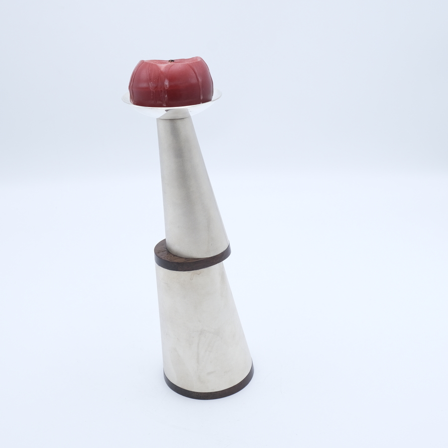 Een eerste gehalte (925/1000) zilveren design kandelaar, ‘Verschoven licht’ door Elske Klik. Conisch gematteerd zilver met macarubiahout. Galerieprijs 2.500 euro.