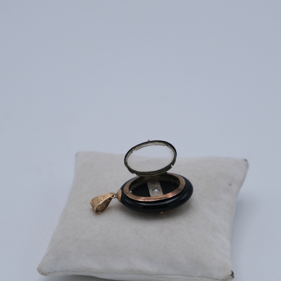 Een antiek 19e eeuws onyx medaillon met 14 karaats (585/1000) gouden montuur, bezet met zaadparels