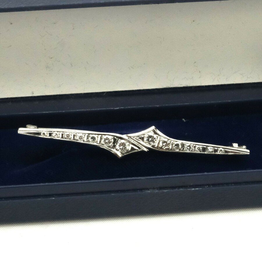 Een vroeg 20e eeuwse langwerpige platina staafbroche, bezet met veertien diamanten, oplopend van 1 tot 3,5 mm.