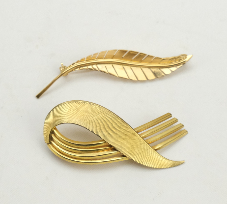 Lot van twee 20e eeuwse gouden broches, waaronder één in de vorm van een veer. Veerbroche gemerkt '750' en 'VI 356'. Andere broche gemerkt '333' en 'GK' met daartussen een ster en maan = Gerb. K...
